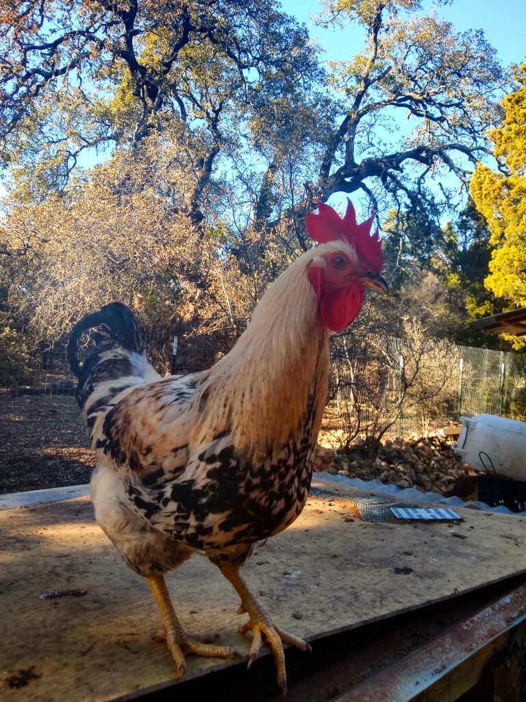 His name is Kenny, named not by me but the people who raised him. He is the sweetest, most beautiful rooster I’ve ever had. He has a cream colored coat, speckled with black, tan, brown and greenish black. His tail shines green in the sunlight. He is absolutely gorgeous. This breed of chicken is known as the Dorking and it originates in Surrey, Southern England. He has that royalty look about him!
