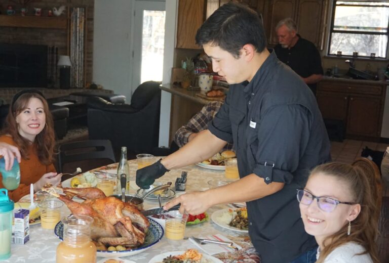 He was also the one who butchered the turkey in the first place. I was in charge of marinating, baking and serving it.