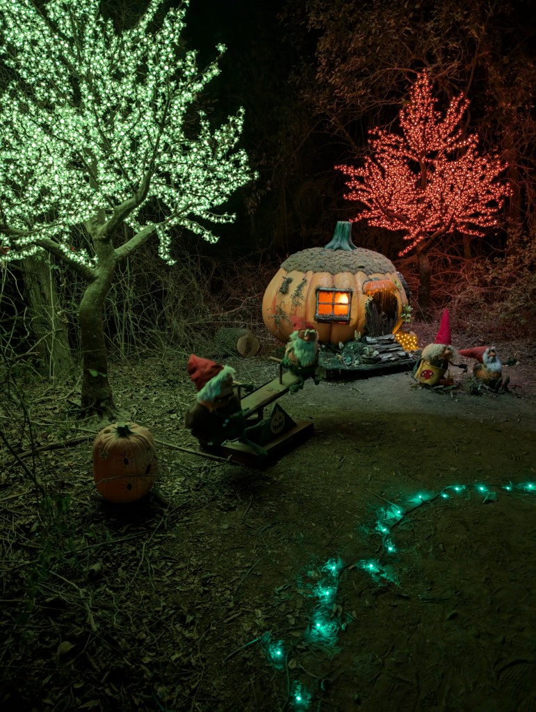 One of my personal favorite parts of the trail was the little gnome and fairy pumpkin houses. They were nestled among glowing trees, with whimsical details that made them feel straight out of a fairytale. Tiny windows, colorful accents, and glowing interiors made you want to shrink down and move right in. Our kids loved peeking inside, pointing out the miniature pumpkins that looked like furniture.