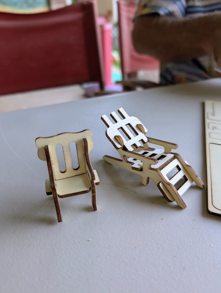 Start simple. Chairs, benches, or a small table are manageable first projects. Kits with pre-cut pieces can speed things up, but free printable patterns are also widely available. Check out Print Mini for some stencils in 1:24 scale. Trace the shapes onto your wood sheets if cutting by hand.