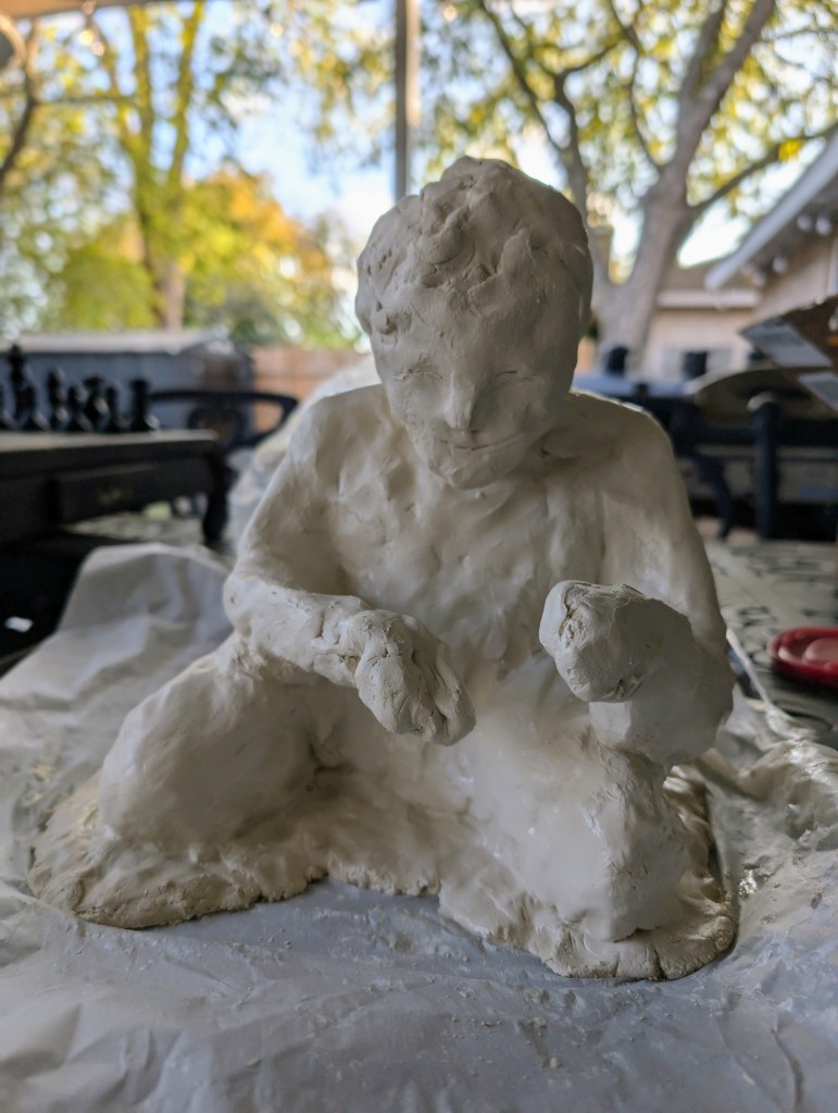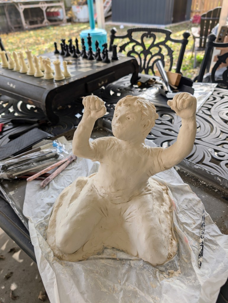 There’s something majestic about a statue, and something beautiful about capturing a moment in time with your hands—especially when it involves your children. Photographs are wonderful, but creating a sculpture brings an entirely new dimension to preserving their personality and smallness at a certain age. Recently, I set out to make a statue of my son Neil, who was three at the time. I wanted to preserve not only his likeness but also his playful, bold little personality. The result was a clay statue we lovingly called “Cheering Child.”