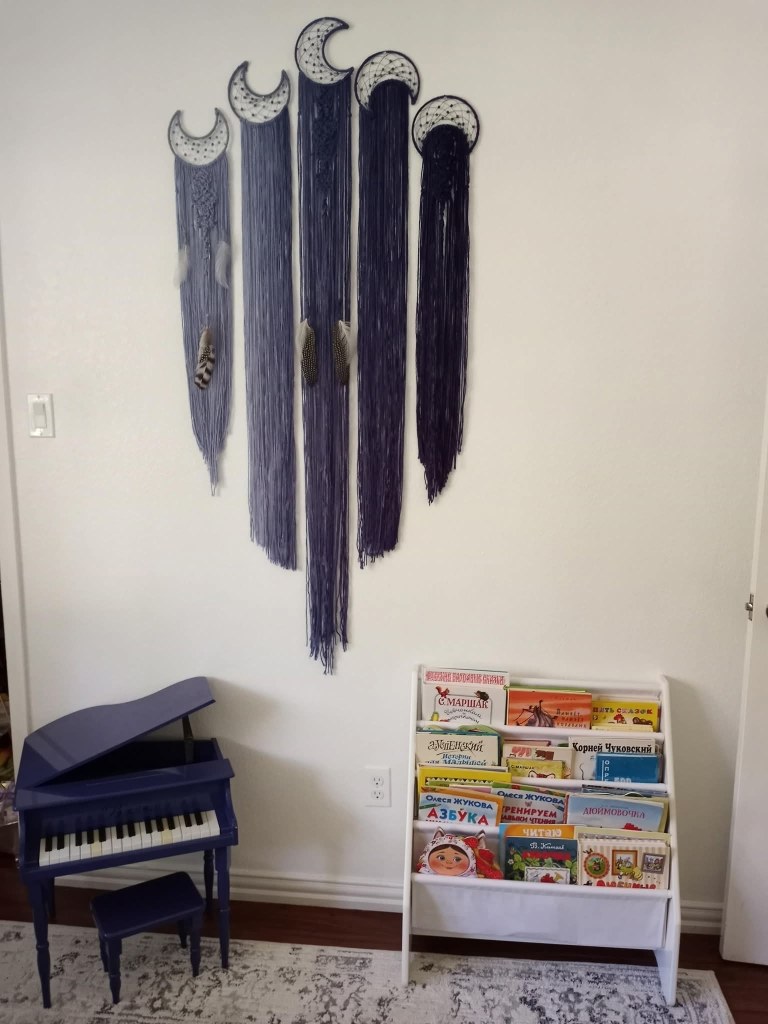 When all five dreamcatchers were complete, I hung them on the wall of Neil’s nursery. They became the centerpiece of the room — across from his crib, beside his little bookshelf and toy piano. The deep navy yarn, moon phases, and natural feathers tied perfectly into the celestial theme we envisioned for him.