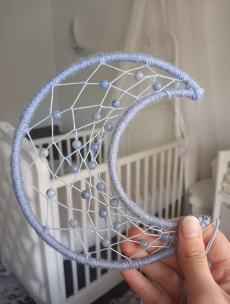 Using embroidery thread, create a dreamcatcher-style web across the crescent. Don’t worry about perfection — asymmetry adds charm. As you weave, thread in small beads so they look like stars scattered in the night sky.