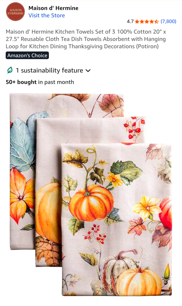 Cotton kitchen towel set with harvest pumpkins โ Functional but decorative, the kind of detail that makes a kitchen feel loved.